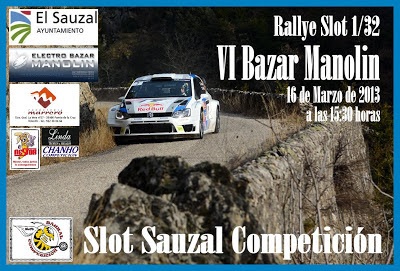 En las instalaciones de la Escudería de Slot Sauzal Competición el pasado sábado día 16 de marzo y con una magnifica participación se celebro el 6º rallye y último de la temporada denominado VI Rallye de Slot Bazar Manolín puntuable para el campeonato de Rallye de asfalto de El Sauzal, el evento estaba patrocinada por la Concejalia de Deportes del Ayuntamiento de El Sauzal y distintas firmas comerciales que gracias a su apoyo se esta desarrollando una brillante temporada 2013 por parte de la Escudería de Slot El Sauzal.
