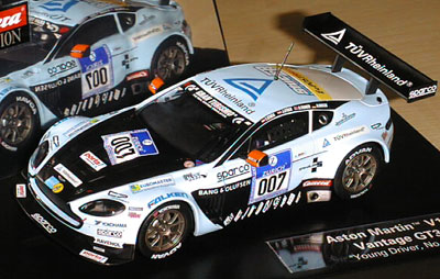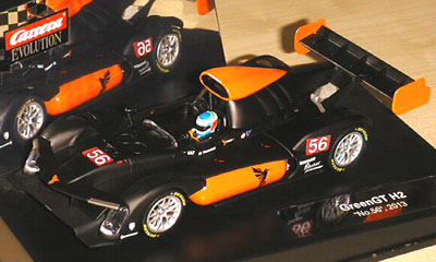 We have three new CARRERA cars in stock. The latest road supercar is LaFerrari which is an exclusive licence item for CARRERA. An unusual model, not yet raced, is the Green GT-H2 which has been scheduled to appear at Le Mans and other circuits but so far has not been seen in competition. The Aston Martin has of course raced many times, and this version has the revised Young Driver livery.